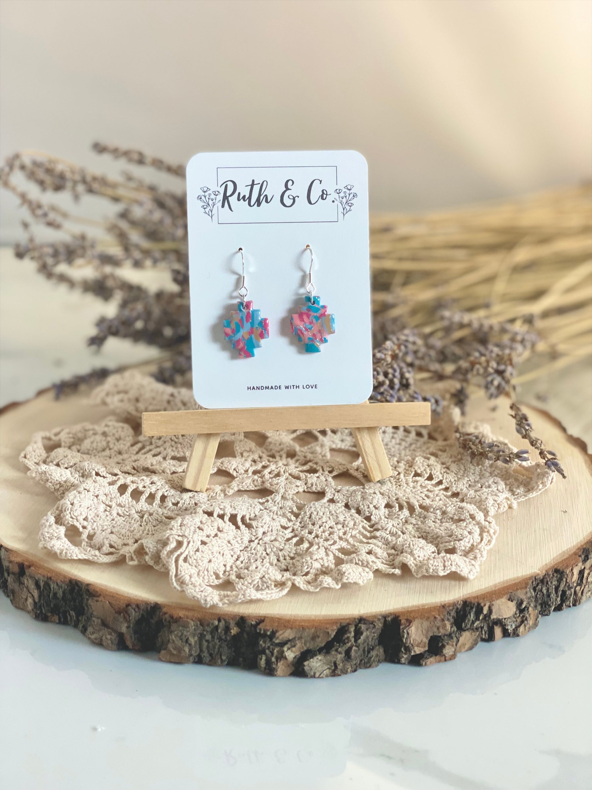 Handcrafted from lightweight polymer clay, these earrings feature an Aztec-inspired shape with a speckled mix of turquoise, pink, and neutral tones. The layered color effect gives each pair its own personality, making no two exactly alike.